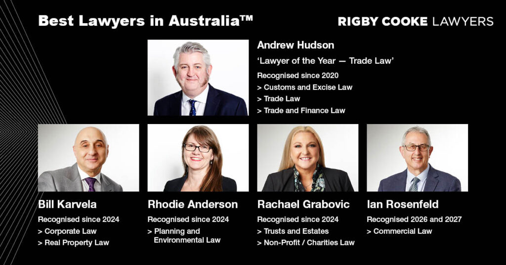 The 19th edition of The Best Lawyers in Australia™ has recognised Rigby Cooke Lawyers’ Andrew Hudson, Bill Karvela, Rhodie Anderson, Rachael Grabovic and Ian Rosenfeld for their expertise and talent in their respective areas of law.